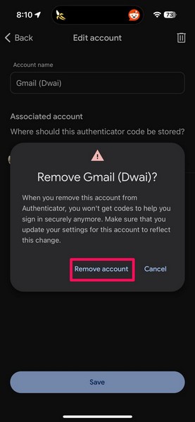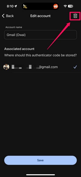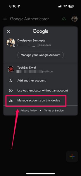 Most egy másik javítás, amellyel megpróbálhatja megoldani a Google Hitelesítő nem működő problémáját az iPhone-on, az az, hogy eltávolítja Google-fiókját az alkalmazásból, és újból hozzáadja azt. Most, mielőtt ezt megtenné, győződjön meg arról, hogy be van jelentkezve azzal a Google-fiókkal, amelyet el szeretne távolítani egy másik eszköz Hitelesítő alkalmazásából. Így a fiók eltávolítása után újra bejelentkezhet az iPhone-on.
