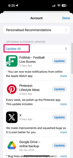 6.Megérintheti a lehetőséget isÖsszes frissítése gombaz összes elérhető alkalmazásfrissítés telepítéséhez iOS-eszközére.