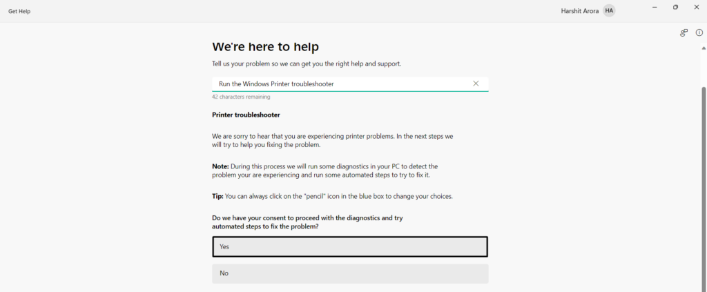 3.VálasztFutmellettNyomtató, és aSegítséget kapApp, válassza ki aIgengomb a továbblépéshez.