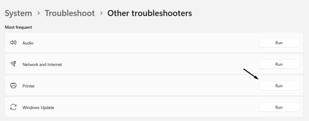 A Windows 11 egy beépített nyomtató és szkenner hibaelhárítóval érkezik, amely az eszközhöz csatlakoztatott nyomtatóval és szkennerekkel kapcsolatos problémákat talál és rögzíti. Ezt szem előtt tartva javasoljukFuttassa ezt az eszköztA számítógépen, és nézd meg, hogy megtalálja -e és javítja -e a HP szkenner problémáit. Kövesse az említett lépéseket a nyomtató és szkenner eszköz végrehajtásához a Windows 11 PC -n: