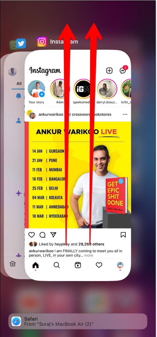 Ezért csúsztassa fel és tartsa meg a kezdőképernyőn az App Switcher megnyitásához. Ezután távolítsa el az alkalmazásokat az Instagram -szal együtt. Ez arra kényszeríti az alkalmazást, hogy állítsa le a háttér tevékenységeit. Néhány másodperc múlva nyissa meg újra az alkalmazást, és ellenőrizze, hogy a probléma megoldódott-e.