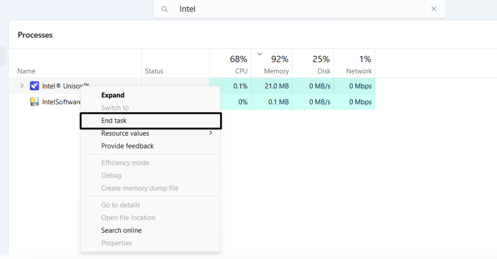 2.Kattintson a jobb gombbalIntel egyhangú-benFeladatvezetőÉs akkor válassza ki aVégső feladatOpció a menüből.