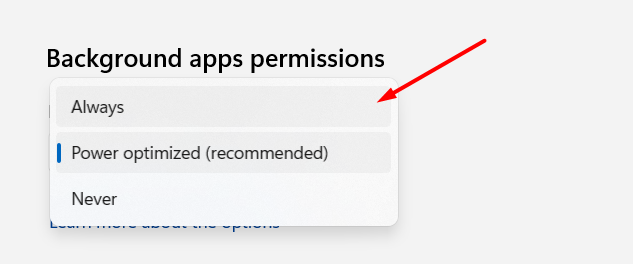 4.A helyi menüből válassza a VálasszonHaladó lehetőségekés elmegyHáttér -alkalmazások engedélyek-