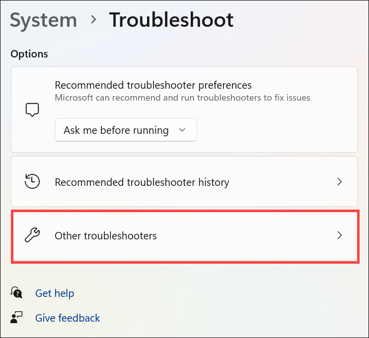 2.ABeállítások alkalmazás, válassza aHibaelhárításopció a bal oldalon és akkorEgyéb hibaelhárítók-