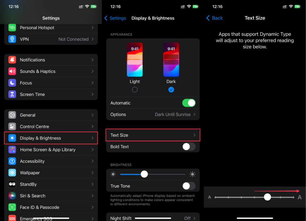 3.Mozgassa a csúszkát jobbra, hogy növelje az iPhone szöveges méretét. Állítsa be a szöveg méretét az Ön preferenciája szerint.