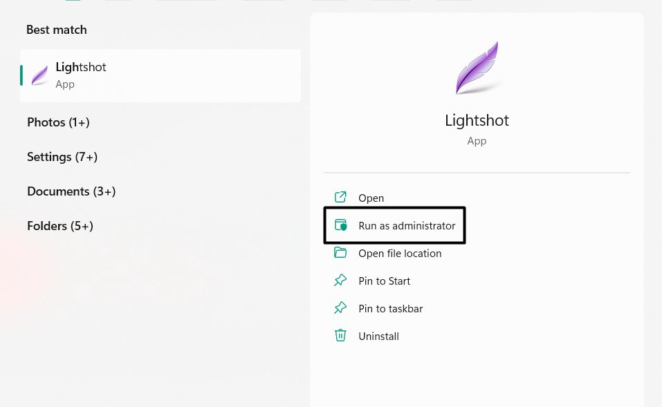 Lehetséges, hogy a LightShot alkalmazás hiányzik az adminisztratív jogokból, ezért nem működik megfelelően a Windows 11 számítógépén. Ezt az okot szem előtt tartva,Indítsa el a LightShot alkalmazást rendszergazdakéntA készüléken, és ellenőrizze, hogy ez most lehetővé teszi a képernyőképek készítését. Az alábbiakban hozzáadtuk a LightShot alkalmazás mint rendszergazdaként történő futtatásának lépéseit: