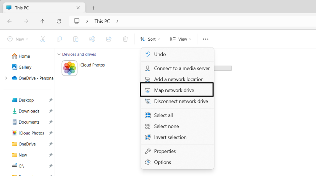 Nyissa meg a Fájlböngészőt, majd kattintson a Három pontra (…) a felső szalagmenüben > Továbbiak > Hálózati meghajtó hozzárendelése