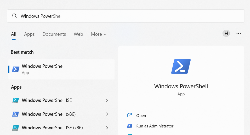 1. Írja be a „powershell” szót a Windows keresősávjába. Kattintson a jobb gombbal a Windows PowerShell legjobb találatára, és válassza a „Futtatás rendszergazdaként” lehetőséget.