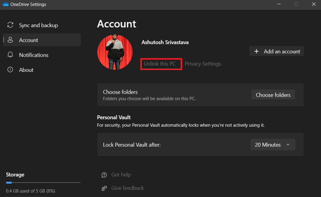 3.Menj aSzámlákszakasz, és kattintson a gombraVálassza le ezt a PC -topció.