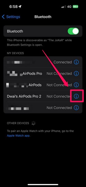 3.Alternatív megoldásként aBluetoothbeállítások oldalon, keresse meg AirPodjait a listában, és koppintson a gombra ‘én‘ gombot.