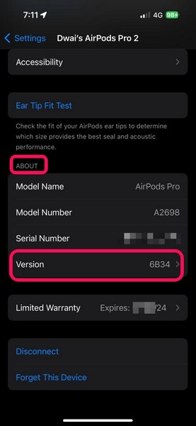 4.Az AirPods információs oldalon görgessen le aKörülbelülszakaszt, és ellenőrizze az AirPods készülékhez jelenleg telepített firmware-verziót a mellettVáltozatopció.