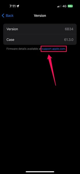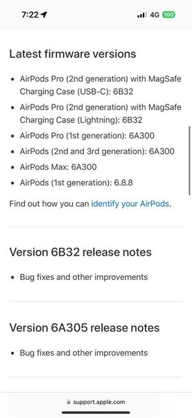 6.Ezután érintse meg asupport.apple.comezen az oldalon található linkre kattintva az AirPods firmware-információs oldalára léphet az Apple hivatalos webhelyén.
