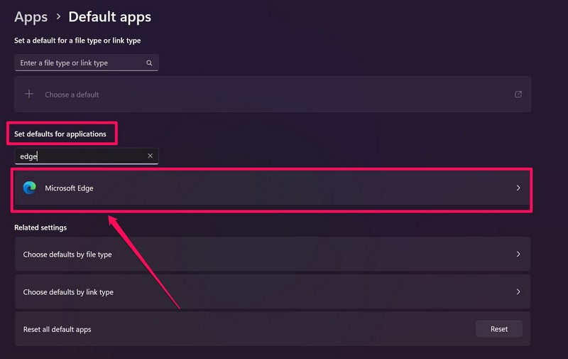3.alatt aÁllítsa be az alkalmazások alapértelmezett beállításaitrészben használja a keresősávotkeresse meg a Microsoft Edge-t.
