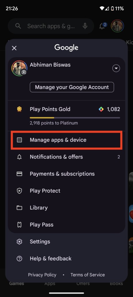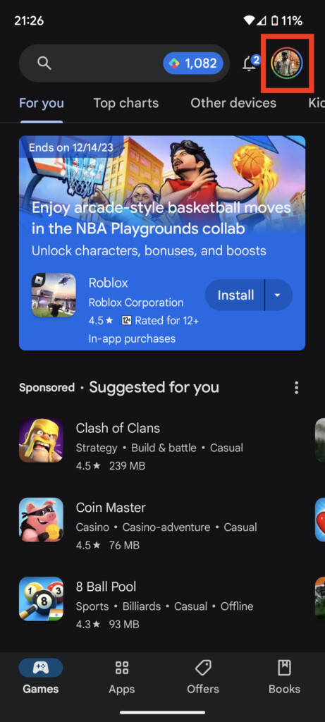 1.IrányPlay Áruházés koppintson a profilképére a jobb felső sarokban.