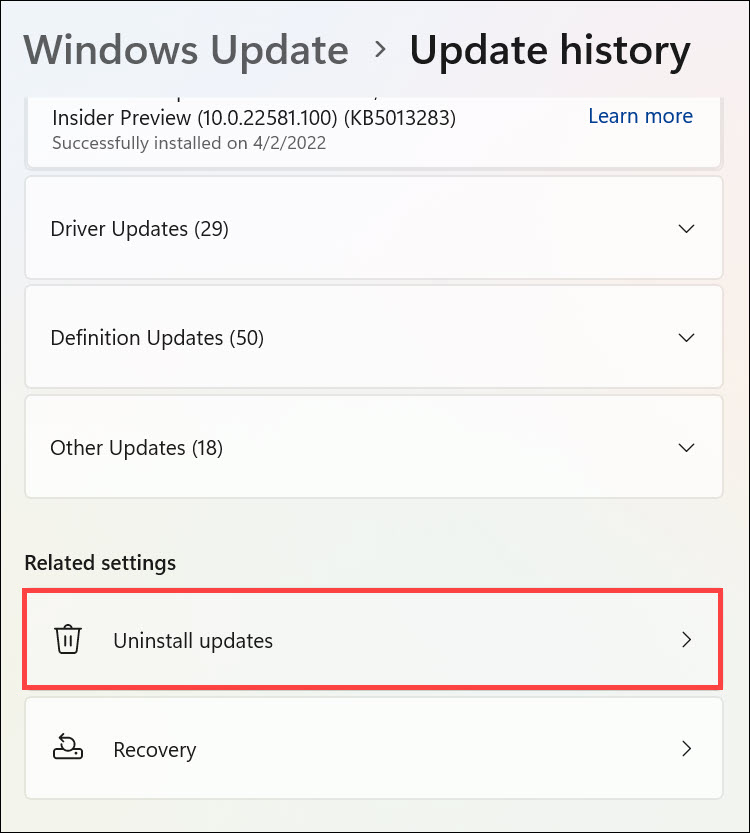 3.A frissítés előzménye alatt kattintson aTávolítsa el a frissítéseketA „Kapcsolódó beállítások” címsor alatt.