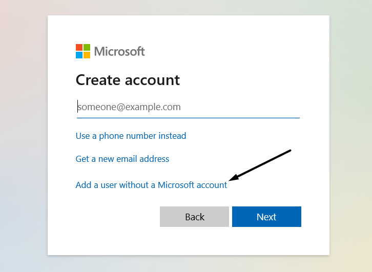 5.Válassza ki aAdjon hozzá egy felhasználót Microsoft-fiók nélkülopciót, majdKövetkezőhogy menjünk előre.