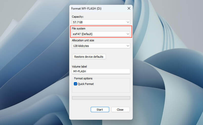 PC:Kattintson a jobb gombbal a File Explorer flash meghajtóra, és válassza kiFormátum- A formátum párbeszédpanelen állítsa beFájlrendszer-hozkivágásés válasszonIndul-