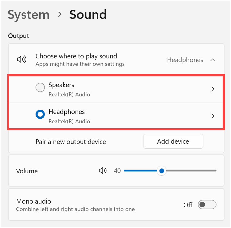 2.A kimeneti címsor alatt kattintsonVálassza ki, hol játssza le a hangot-