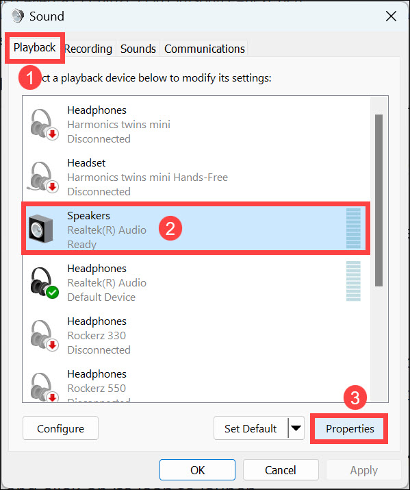 2.Most váltson aLejátszásfül, válassza ki aHangszóró, és kattintsonTulajdonságokalján.