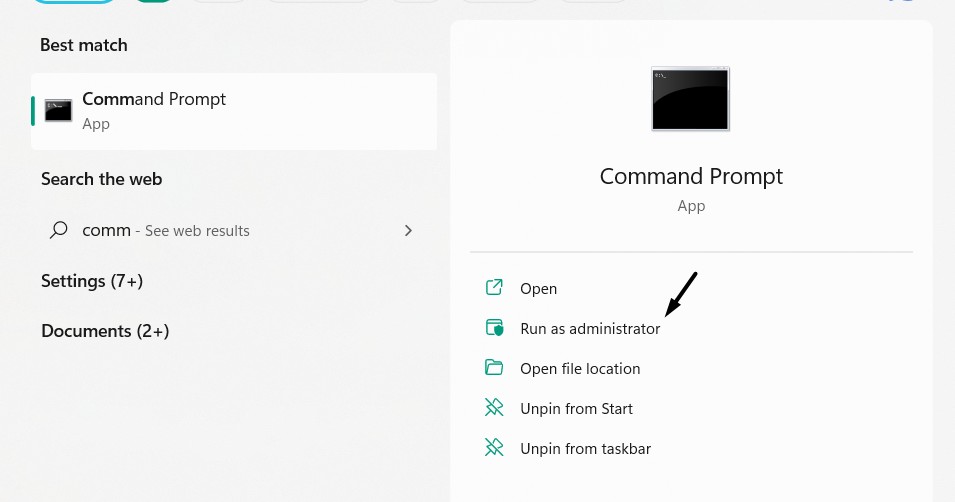 1.Nyomja meg aWindows kulcs, típuscmdbenne, és válasszonFuttassa rendszergazdakéntaz eredményekből.