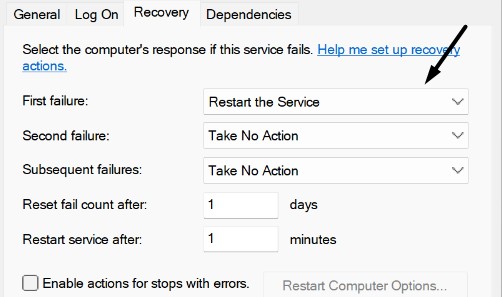 5.Ha elkészült, menjen aHelyreállítás lapés állítsa be aElső kudarcopciótIndítsa újra a szolgáltatást.