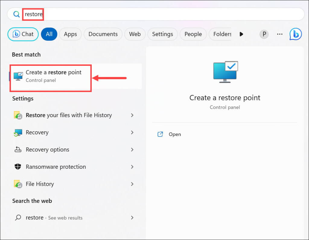 1.NyitottWindows keresőmező, típusHozzon létre egy visszaállítási pontotbenne, és válassza ki a keresésből.