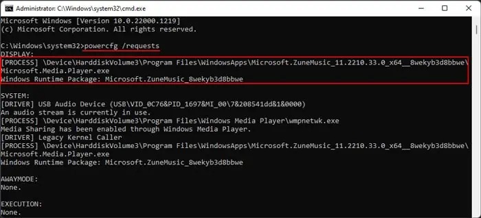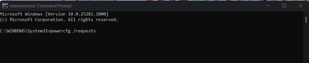 3.Írja be vagy másolja bepowercfg /requestsa Parancssor alkalmazásban a jelentés létrehozásához.