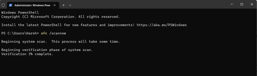 A képernyővédővel kapcsolatos problémák megoldásának egyik módja azfuttassa az SFC vagy a System File Checker vizsgálatot. Az SFC-ellenőrzés megkeresi a sérült rendszerfájlokat, és kijavítja azokat úgy, hogy lecseréli őket a számítógépen tárolt gyorsítótárazott változatukra. Ennek eredményeként ez is megoldja a problémát. Tehát kövesse az alábbi utasításokat az SFC-vizsgálat futtatásához a Windows 11 számítógépen: