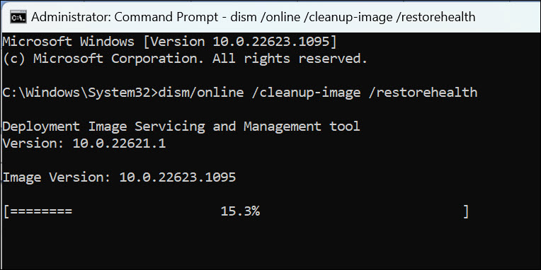 DISM /Online /Cleanup-Image /CheckHealthDISM /Online /Cleanup-Image /ScanHealthDISM /Online /Cleanup-Image /RestoreHealth2.A fenti parancsok végrehajtása után a DISM-vizsgálat elindul a Windows 11 számítógépen.