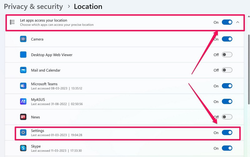 4.Amíg itt van, engedélyezze aEngedélyezze az alkalmazások számára, hogy hozzáférjenek a tartózkodási helyéhezopciót is, és győződjön meg arról, hogy a kapcsolót aBeállítások elemreengedélyezve van a listán.