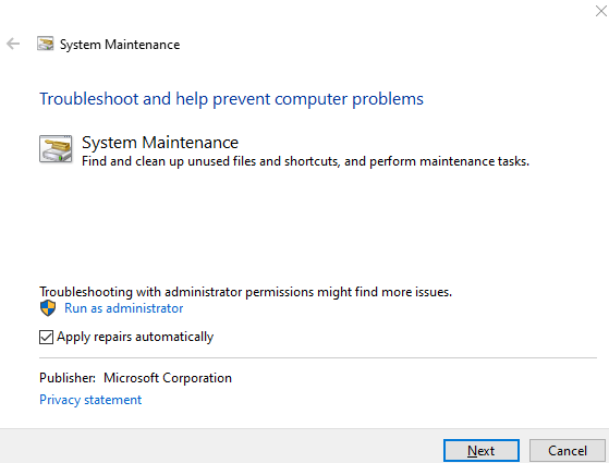 Jegyzet:Újra nyitja meg a segédprogramot az adminisztrátor hozzáféréssel, ha rákattint a „Run administrátorként” című linkre, ha látja. Ennek eredményeként növekszik a probléma megoldásának esélye.