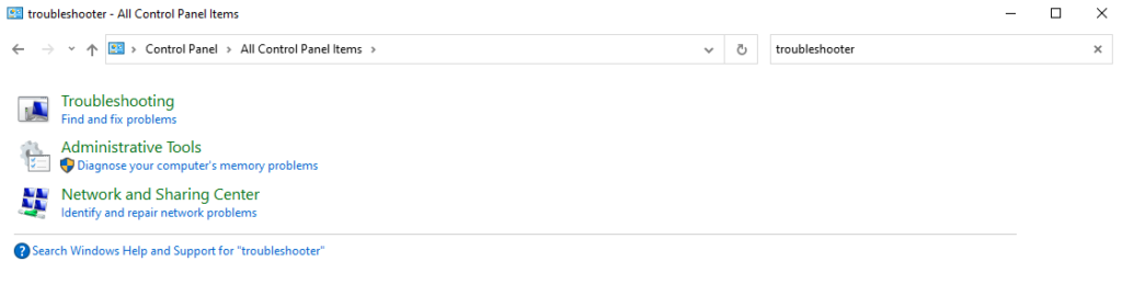 3. lépés:Miután a hagyományos kezelőpanel menüben tartózkodik, használja a tetején lévő keresősávot a „Hibaelhárító” beírásához a megoldások megtalálásához.