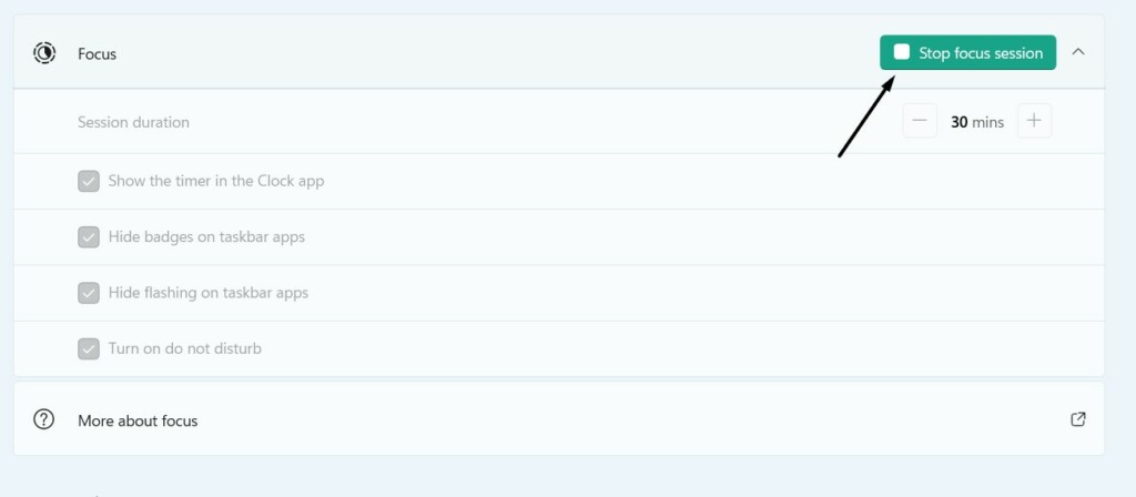 2.Ha a fókuszos asszisztens engedélyezve van, akkor láthatja aStop Focus Sessiongomb aFókuszszakasz. Kattintson aStop Focus Sessiongomb a fókusz asszisztens kikapcsolásához és a riasztások fogadásának megkezdéséhez.