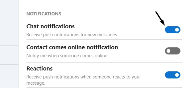3.AÉrtesítésekablak, győződjön meg arról, hogy aCsevegési értesítésekA kapcsoló be van kapcsolva.