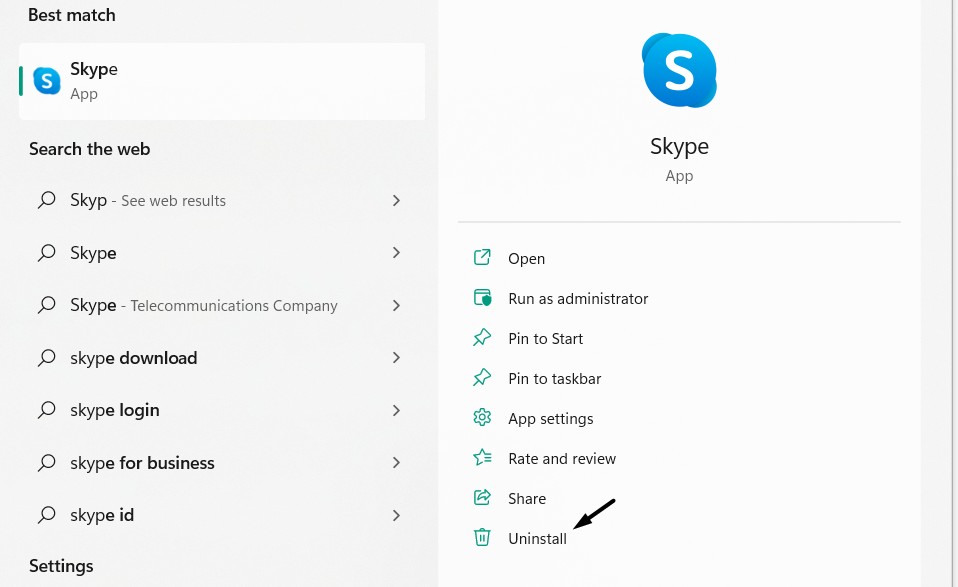 1.Nyomja meg aWindows keresőmező, írja beSkypebenne, és válassza kiEltávolítaz eredményekből.