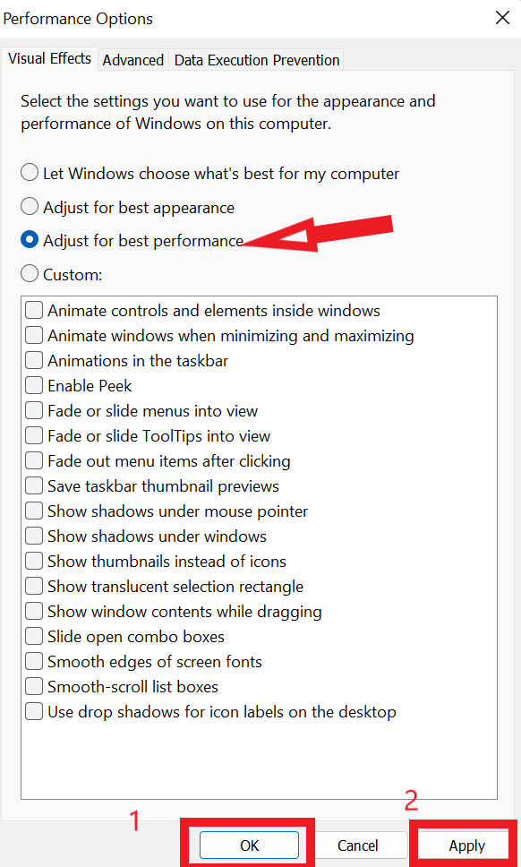 - Most a Visual Effects fül alatt válassza ki az opciótÁllítsa be a legjobb teljesítményt-