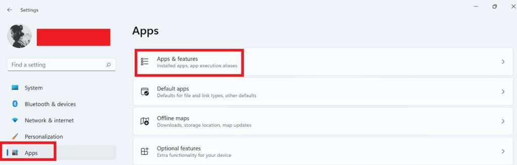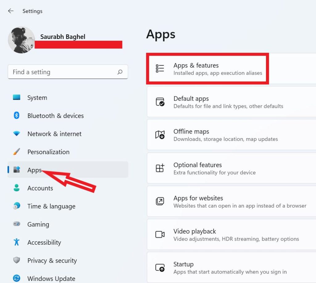 - A beállítások jobb oldalán a Windows Érintse megAlkalmazásokÉs aztán a jobb oldalon kattintsonAlkalmazások és szolgáltatások.