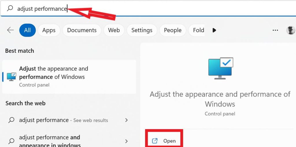- Kattintson a keresési ikonra és a gépelésreÁllítsa be a teljesítménytés nyissa meg a legelső javaslatot.