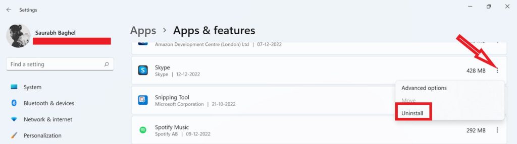 - Görgessen le és keresse megSkype.Most érintse meg aHárom függőleges pont ikonellene és válasszonTávolítsa el.