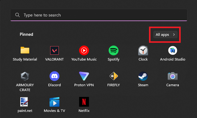 1.Sajtóa Wingombot a számítógép Start menüjének megnyitásához, majd kattintson a gombraMinden alkalmazás.