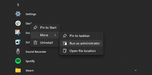 2.Most görgessen le, és keresse meg a Slack-et. Ha megtalálta, kattintson a jobb gombbal a névre, kattintson a gombratöbb, majd válassza ki a lehetőségetFuttassa rendszergazdakéntopció.