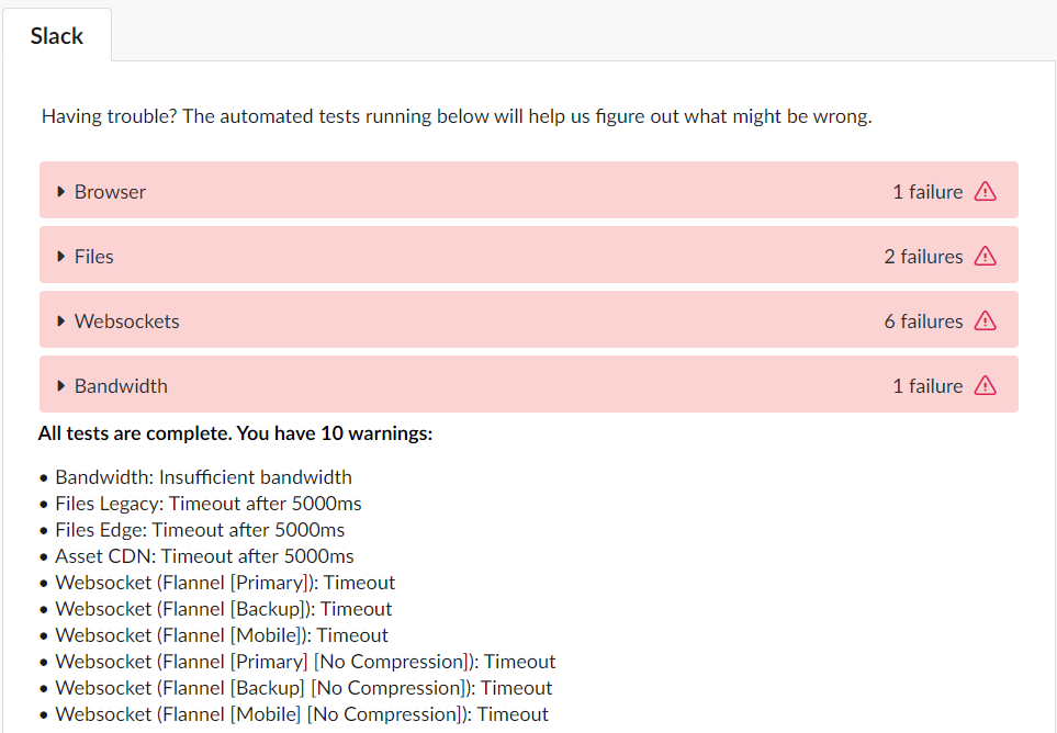 2.Megnyílik a weboldal a Slack-kel való kapcsolat ellenőrzéséhez. A weboldal mindent tesztel, beleértve a böngészőt, a fájlokat, a WebSocketeket és a sávszélességet, és a végén megmutatja a problémákat, ha vannak.