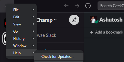 2.Most kattintson a gombraSegítségés válassza ki aEllenőrizze a frissítéseketlehetőség a Slack legújabb verziójának megtekintéséhez és letöltéséhez.
