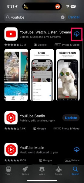 7.Menj aKeresés fülAz alsó navigációs sávon,Használja a fenti keresősávotA YouTube alkalmazás megtalálásához és aLetöltés gombmellette.