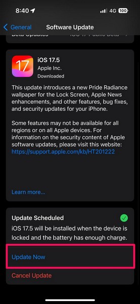 5.Miután az iOS frissítés elérhetővé válik, érintse meg aFrissítse mostvagyLetöltés és telepítés gomb(attól függően, hogy melyik áll rendelkezésre az Ön számára) a frissítés kezdeményezéséhez.