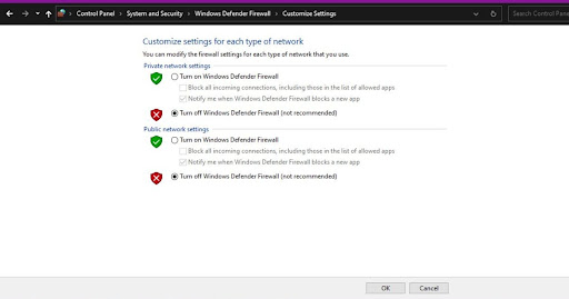 - VálasszonKapcsolja be a Windows Defender tűzfalat(mind a magán, mind a nyilvános hálózati beállításokhoz).