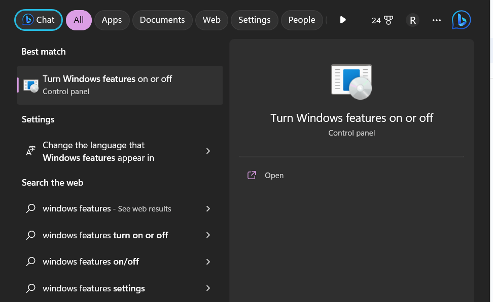 2. lépés: Írja be a „Windows funkciók” beírását a keresősávba, vagy kezdje el a gépelést közvetlenül a Start menüben. A keresési eredményekről kattintson a „Kapcsolja be a Windows Funkciók be- vagy kikapcsolása” lehetőséget.