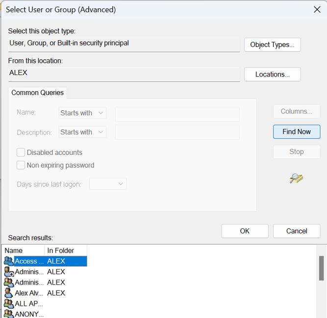 6. lépés:A Windows PC-jén elérhető felhasználók megkereséséhez kattintson a Keresés most gombra. Válassza ki felhasználónevét a keresési eredmények közül alul, majd kattintson az OK gombra.