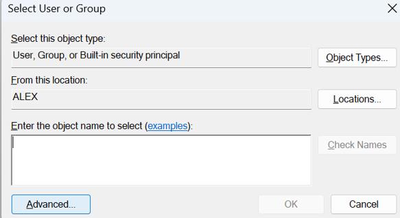 5. lépés:A Felhasználó vagy csoport kiválasztása (Speciális) ablak eléréséhez kattintson a Speciális gombra.