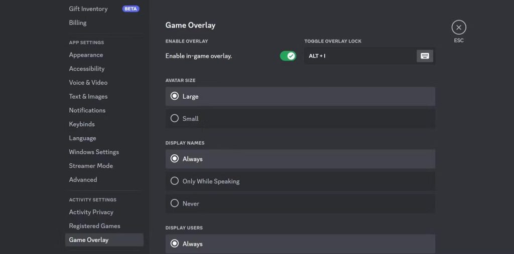 2. lépés:Válassza kiGame Overlayés ellenőrizze a konfigurált gyorsbillentyűt alattKapcsolja be az átfedés zárolását.